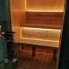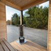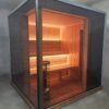 Le caractère unique de ce modèle réside dans son utilisation extensive de verre. Les deux murs et les portes sont en verre de 8 mm d’épaisseur, disponible en noir ou en brun, offrant une vue dégagée sur la nature environnante tout en créant une sensation d’espace et d’ouverture. À l’intérieur du sauna, vous trouverez des murs et un toit en bois de tilleul. Ce bois est non seulement esthétique, mais a également une faible conductivité thermique, assurant une expérience de sauna confortable et sécuritaire. Les bancs du sauna sont également en bois de tilleul, garantissant une esthétique uniforme et un confort optimal.