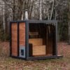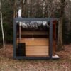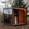 Le sauna est équipé d’une vaste vitre panoramique en verre trempé de 2,0 mètre sur 2,0 mètre, offrant une vue magnifique et une luminosité naturelle. En option, vous pouvez opter pour un éclairage LED extérieur, parfait pour mettre en valeur le sauna de nuit.