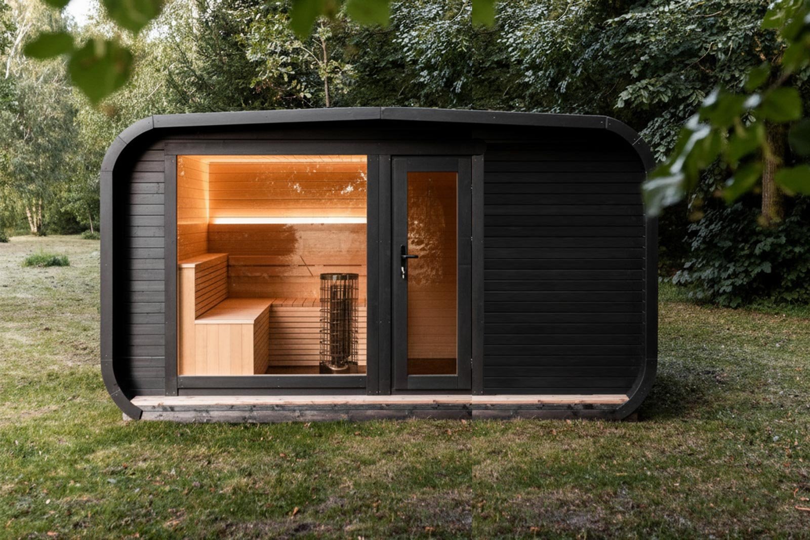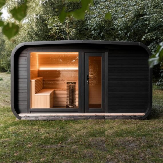 Les dimensions extérieures sont de 4,20 mètres sur 2,45 mètres, mais ils pourraient être modifiables. L’espace sauna est équipé d’une vaste vitre panoramique en verre trempé de 1,5 mètre sur 1,75 mètre, offrant une vue magnifique et une luminosité naturelle. La porte d’entrée, conçue en bois, est également dotée d’une vitre en verre trempé pour un design moderne et élégant. En option, vous pouvez opter pour un éclairage LED extérieur, parfait pour mettre en valeur le sauna de nuit.