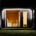Les dimensions extérieures sont de 5,00 mètres sur 2,45 mètres, mais ils pourraient être modifiables. L’espace sauna est équipé d’une vaste vitre panoramique en verre trempé de 1,5 mètre sur 1,75 mètre, offrant une vue magnifique et une luminosité naturelle. La porte d’entrée, conçue en bois, est également dotée d’une vitre en verre trempé pour un design moderne et élégant. En option, vous pouvez opter pour un éclairage LED extérieur, parfait pour mettre en valeur le sauna de nuit.