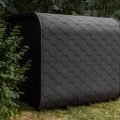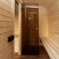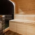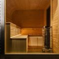 À l’intérieur, un vestiaire spacieux de 2,85 mètre de large est aménagé, équipé d’un éclairage LED au plafond et d’une prise électrique sous le banc. L’espace sauna, mesurant 2 mètres sur 2 mètres, comprend des bancs à deux niveaux en bois d’aulne ou de tremble de classe A, garantissant confort et durabilité. Ce modèle peut accueillir jusqu’à 8 personnes, offrant une expérience conviviale et luxueuse.