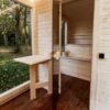 L’espace sauna, mesurant 2 mètres sur 2 mètres, comprend des bancs à deux niveaux en bois d’aulne ou de tremble de classe A, garantissant confort et durabilité. Ce modèle peut accueillir jusqu’à 8 personnes, offrant une expérience conviviale et luxueuse.