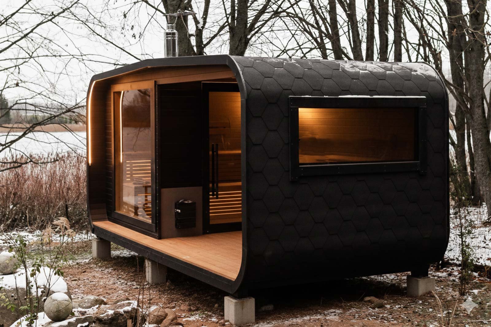 Le sauna est doté d’une impressionnante vitre panoramique en verre trempé mesurant 2,0 mètres sur 2,0 mètres, qui baigne l’intérieur de lumière naturelle et offre une vue imprenable sur les environs. Pour un effet encore plus spectaculaire, un éclairage LED extérieur peut être ajouté en option, parfait pour créer une ambiance élégante et chaleureuse en soirée.