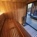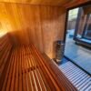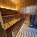 La décoration intérieure des murs comprend des cadres en bois de 45×95, du film pour sauna, des cadres à espace d’air et des panneaux en aulne noir élégants. Les lits du sauna sont disponibles en deux tailles : l’un mesurant 2,02 m de long et 45 cm de large, et l’autre 2,02 m de long et 65 cm de large, tous deux avec un dossier confortable de 25 cm. De plus, il y a un éclairage LED intégré et un chauffage électrique Harvia shoulder 9Kw triphasé, accompagné de pierres volcaniques, d’un siphon de drainage et d’une douche de sauna.