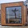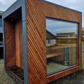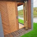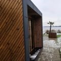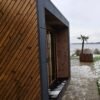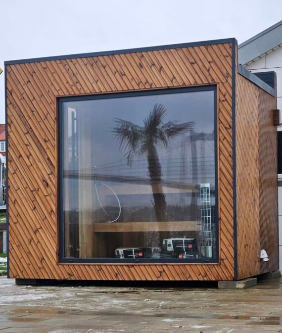 La vitrine est dotée d’un cadre en aluminium et est trempée avec trois couches de verre, tandis que la porte en verre du sauna présente un design trempé avec un cadre en aluminium noir. Enfin, la façade avant est ornée de sapin thermique décoratif, accompagné d’un éclairage extérieur LED, d’un interrupteur de design moderne sauvage de Schneider, de planches de terrasse en pin brûlé et d’une décoration de périmètre de façade avec des plis métalliques, tous discrètement fixés.